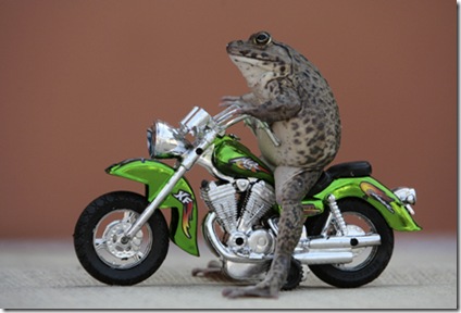 Oui the frog sits on a miniature motorcycle in the eastern beach town of Pattaya January 10, 2008. Oui's owner says Oui loves playing with human toys and posing for photographs.