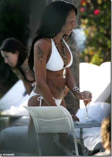 Melanie Brown (Mel B) was spotted enjoying her holiday with husband Stephen Belafonte in Miami on March 13. The 32-year-old spicy girl showed off her body generously in a white two-piece bikini while relaxing pool side with a cigarette and a glass of champagne.
