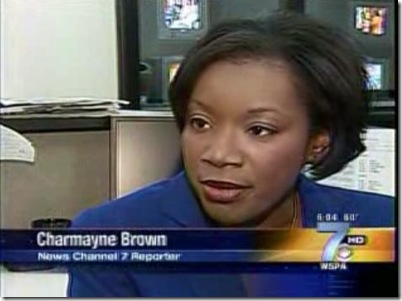 Charmaine Brown, or Charmayne Brown (biography), is a 12-year veteran black reporter of News Channel 7 (WSPA-TV) in South Carolina. Charmaine Brown and photographer Ti Barnes were attacked by the murder suspect's four family members when they were covering the scene of a homicide investigation in Union county. From WSPA