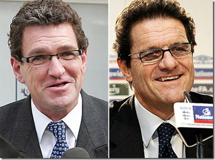 Meet Michael McElinney (picture left), an Irish-born builder who extremely look like new England manager Fabio Capello! Although he is 45 and the Italian is 61, Mr. McElinney believes the similarity between them could be so lucrative that he might even sell his construction business to impersonate him full time. Source: MailonSunday #Tags: Fabio Capello, impersonator, Michael McElinney