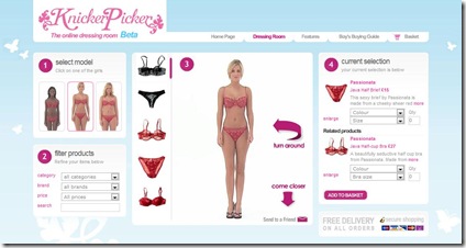 Knicker Picker, aka the online dress room, is a website currently in Beta version which sells women's undergarments. It is different from those which only present sold item online, Knicker Picker can allow customers to try their desired bra, knicker, thong and among others on a real life model by dragging and dropping. As it is a British site, Knicker Picker will charge customers on sterlings. Link