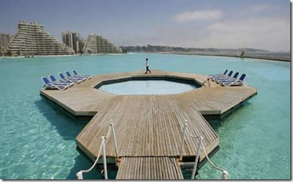 The world's largest swimming pool which has been acknowledged by the Guinness World Records locates at the resort of San Alfonso del Mar in Algarrobo city on the southern coast of Chile. It measures 1,013 metres (3,323 ft) in length, covers an area of eight hectares (20 acres), contains 250,000 cubic meters of water. Link