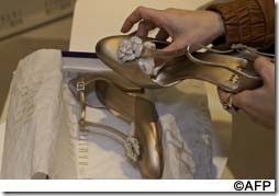 The shoes, designed by Stuart Weitzman, feature two diamond roses, fixed to 1940s-style beige metallic T-strap high heels, made with more than 1800 diamonds weighing 100 carats.