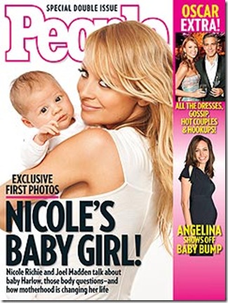 What you see the image above is the cover of latest issue of People, which features one of the first photos of Harlow Winter Kate Madden and mom Nicole Richie. It is unclear how much People paid Richie and boyfriend Joel Madden for the rights to publish. The 2-month-old Kate Madden was born Jan. 11 at Cedars-Sinai Medical Centre in Los Angeles.