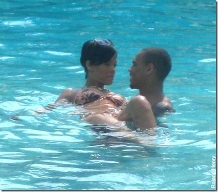 The attractive pair, who got matching star tattoos on their necks in January, got in the pool after a leisurely lunch yesterday at the Hilton Kingston Hotel in Jamaica. They were hanging out with friends and at about 3 p.m., Chris, 18, jumped into the water and waited while Rihanna went to her room and changed into a bikini.